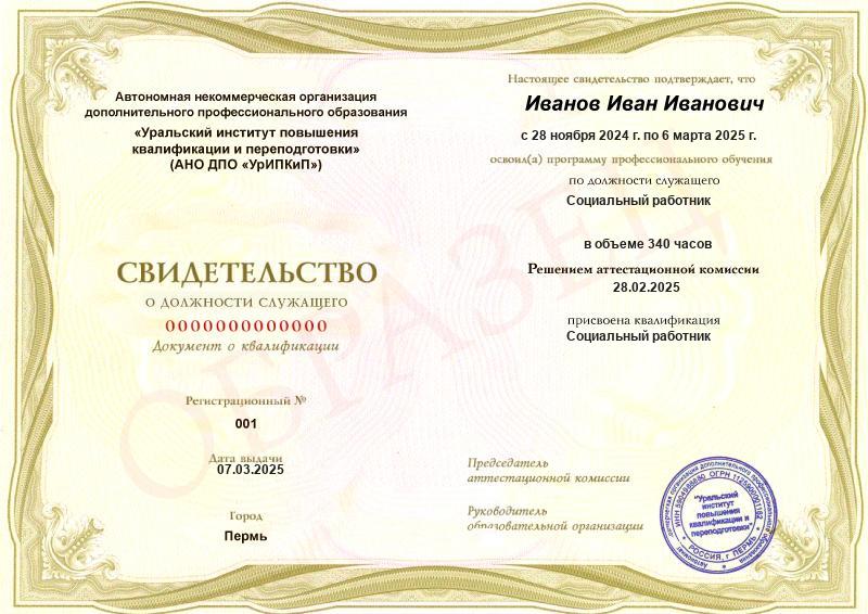 Заполненные образцы выдаваемых документов есть в описании учебных курсов и на странице «Лицензия. Документы», а также на главной странице официального сайта АНО ДПО «УрИПКиП».