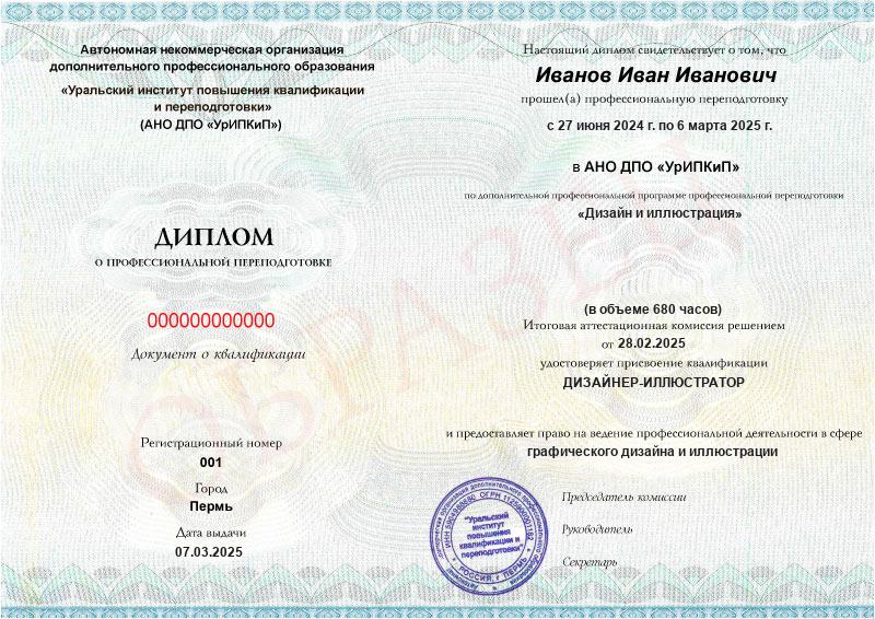 Да, дипломы и удостоверения оформляются в соответствии с действующим законодательством РФ. Документы печатаются на специальных бланках, заверяются печатью АНО ДПО «УрИПКиП».