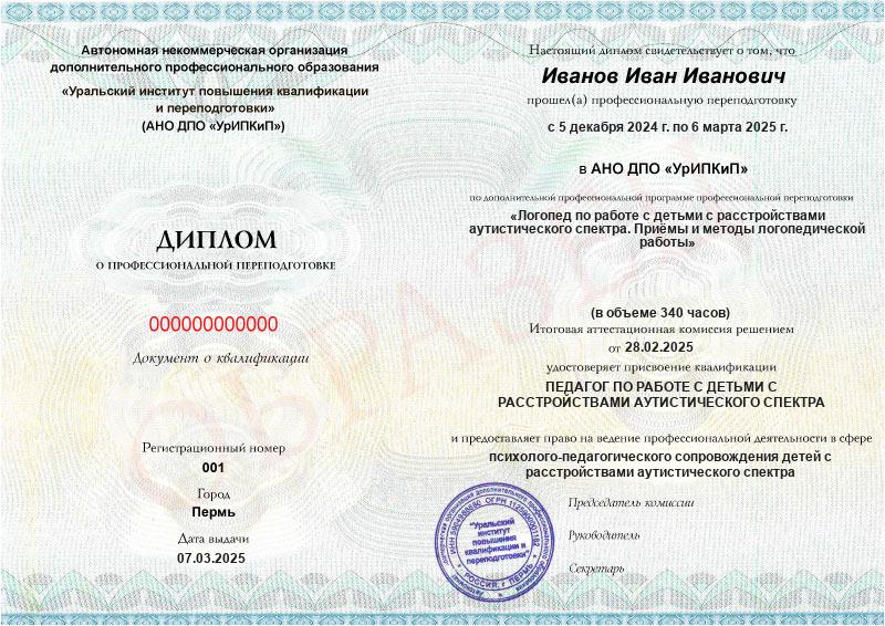 - Квалификация: Педагог по работе с детьми с расстройствами аутистического спектра