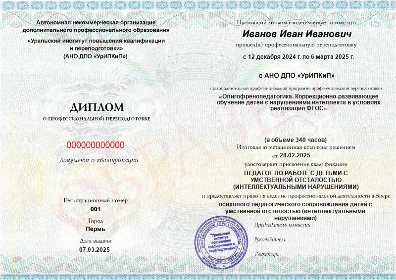 - Квалификация: Педагог по работе с детьми с умственной отсталостью (интеллектуальными нарушениями)