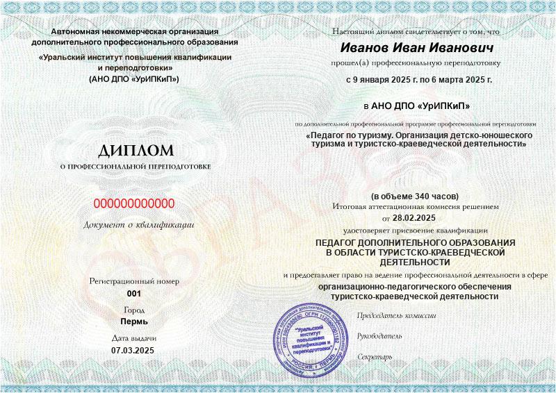 Здравствуйте! Прошёл обучение по специальности «Педагог по туризму», с самого начала было вежливое и внимательное отношение со стороны работников Института, своевременная помощь и поддержка учебного персонала. Обучением и результатами остался доволен, рекомендую всем желающим не сомневаться и тоже пройти дополнительное обучение в Институте!