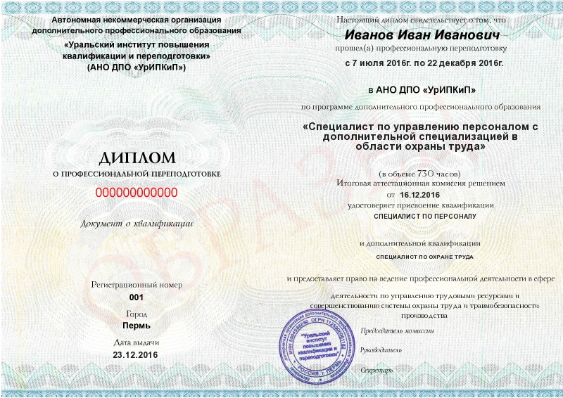 - Диплом АНО ДПО «УрИПКиП» — документ утвержденного образца, признается работодателем, а также комиссией при аттестации